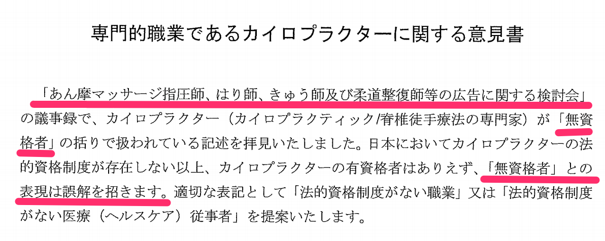 専門的職業であるカイロプラクターに関する意見書