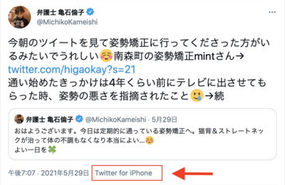 Googleにおけるエクラうめだ(亀石弁護士の法律事務所)の検索連動型広告 - 複雑な手段で整体師を紹介する投稿をしていること(iOSのTwitterアプリで、AのアカウントのURLをコピーし、自らの投稿を引用RTして文章を書き、AのアカウントのURLを貼り付けて投稿したこと。「 Twitter for iPhone」と当時は投稿に表示されていた。)